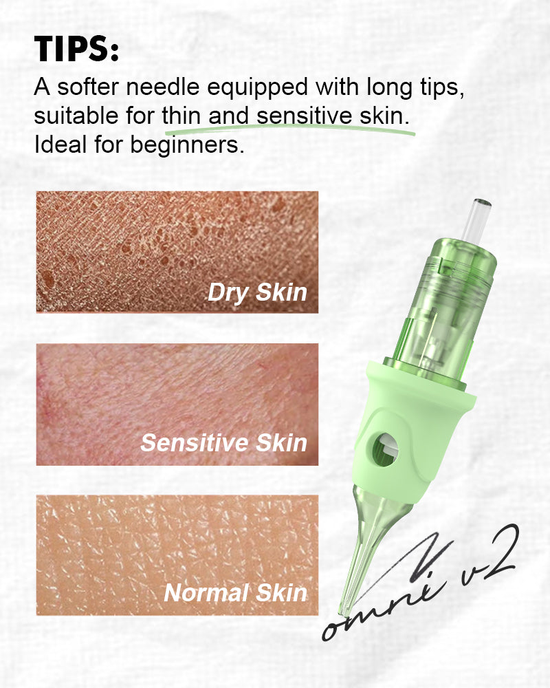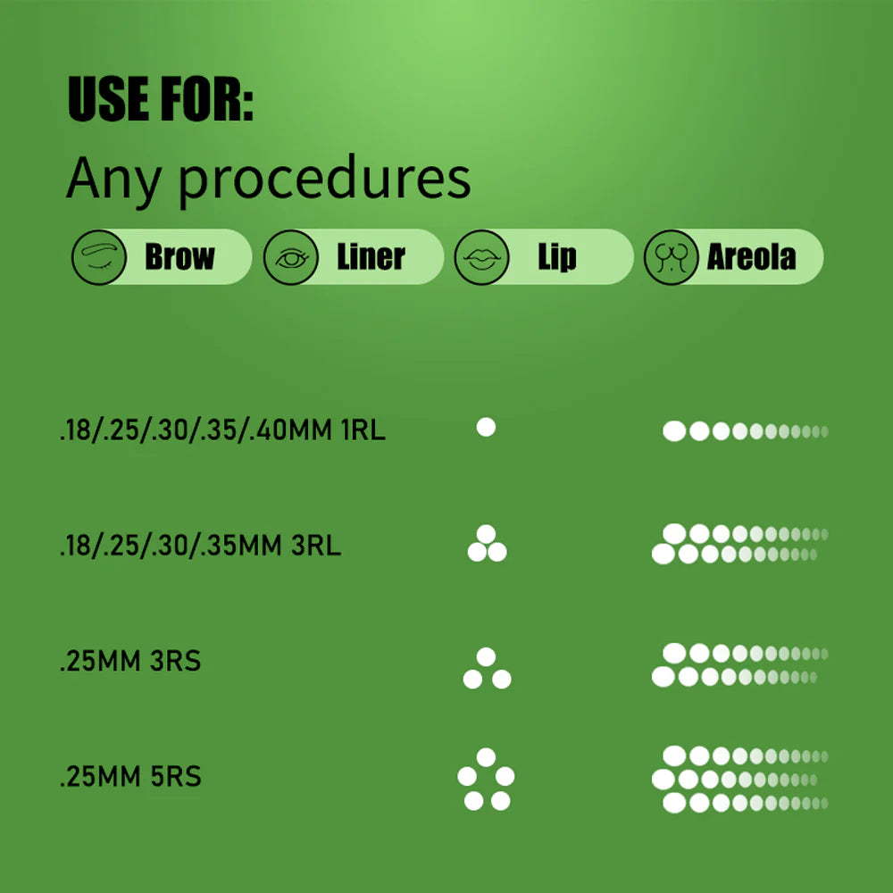 Kompatibilní s mnoha populárními přístroji. Zajišťuje krásně vyhojené výsledky s vynikající retencí barvy. Optimalizované zúžení jehly snižuje trauma pokožky a zlepšuje ukládání pigmentu.